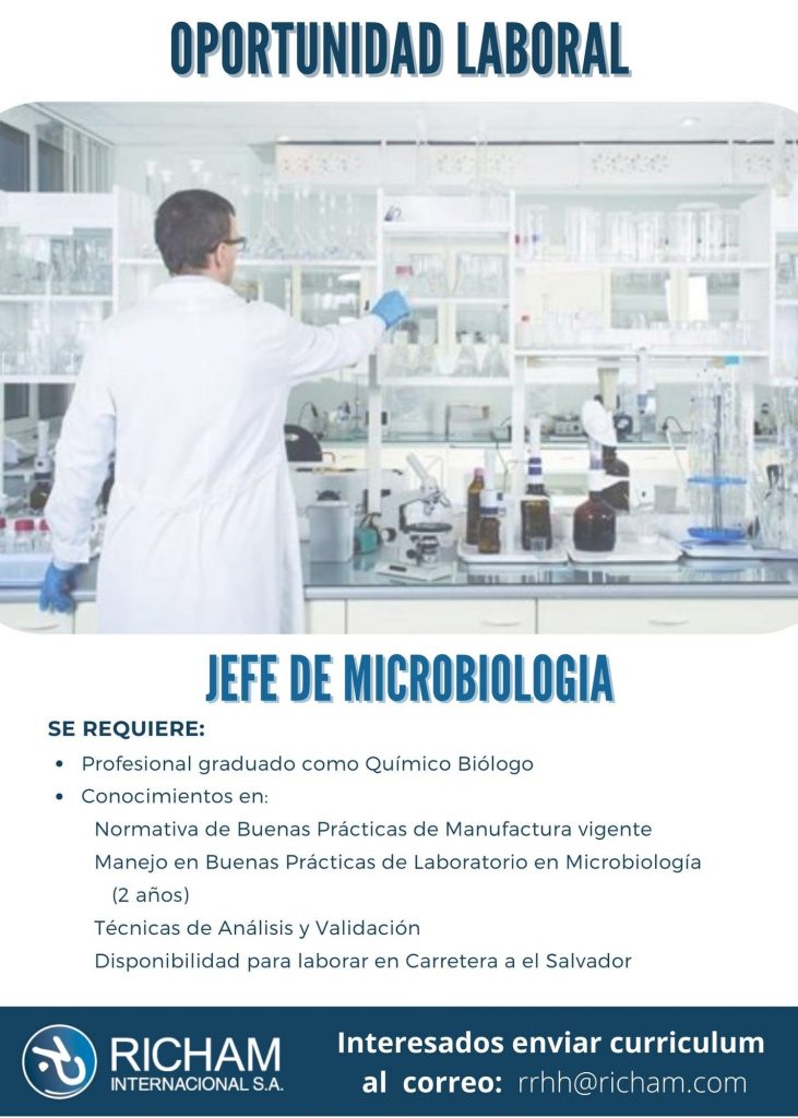 Oportunidad laboral para Químico (a) Biólogo (a) para Jefe de Microbiología.