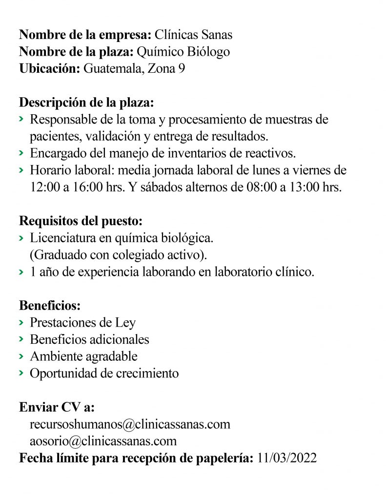 Oportunidad laboral para Químico (a) Biólogo (a) para Laboratorio Clínico.