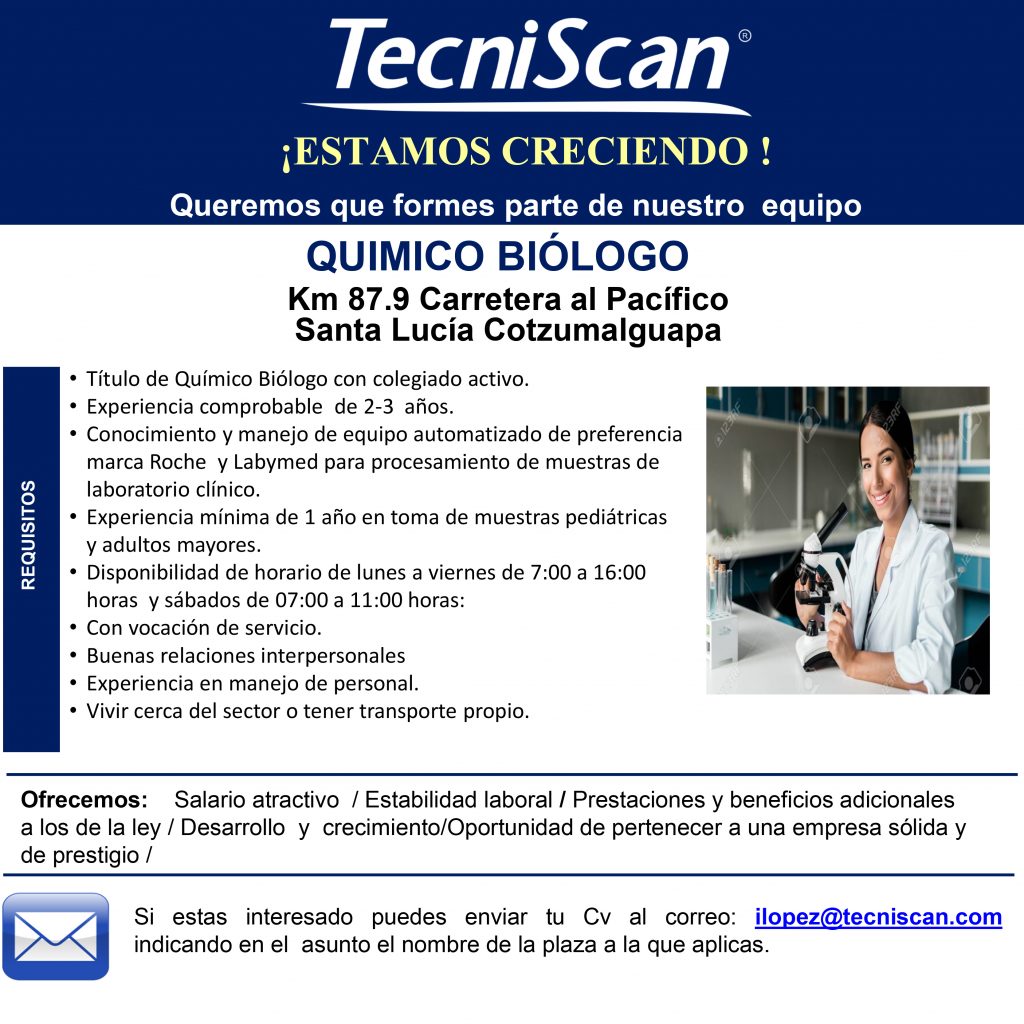 Oportunidad laboral para Químico (a) Biólogo (a) para Tecniscan en Santa Lucía Cotzumalguapa.