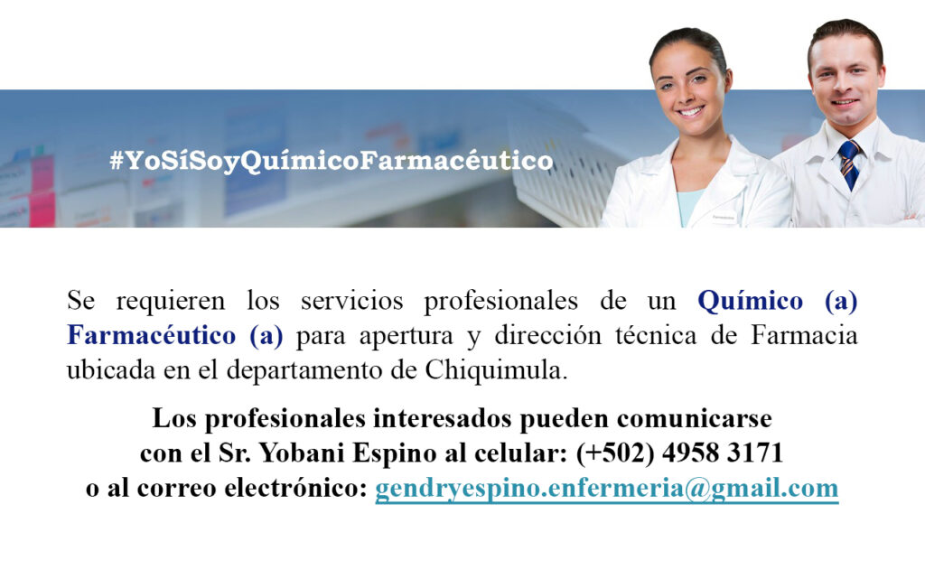 Oportunidad laboral para Químico (a) Farmacéutico (a) para apertura y dirección técnica de Farmacia en Chiquimula.