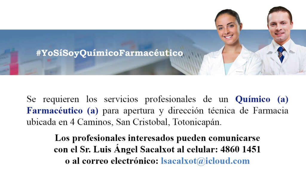 Oportunidad laboral para Químico (a) Farmacéutico (a) para apertura y dirección técnica de Farmacia en Totonicapán.