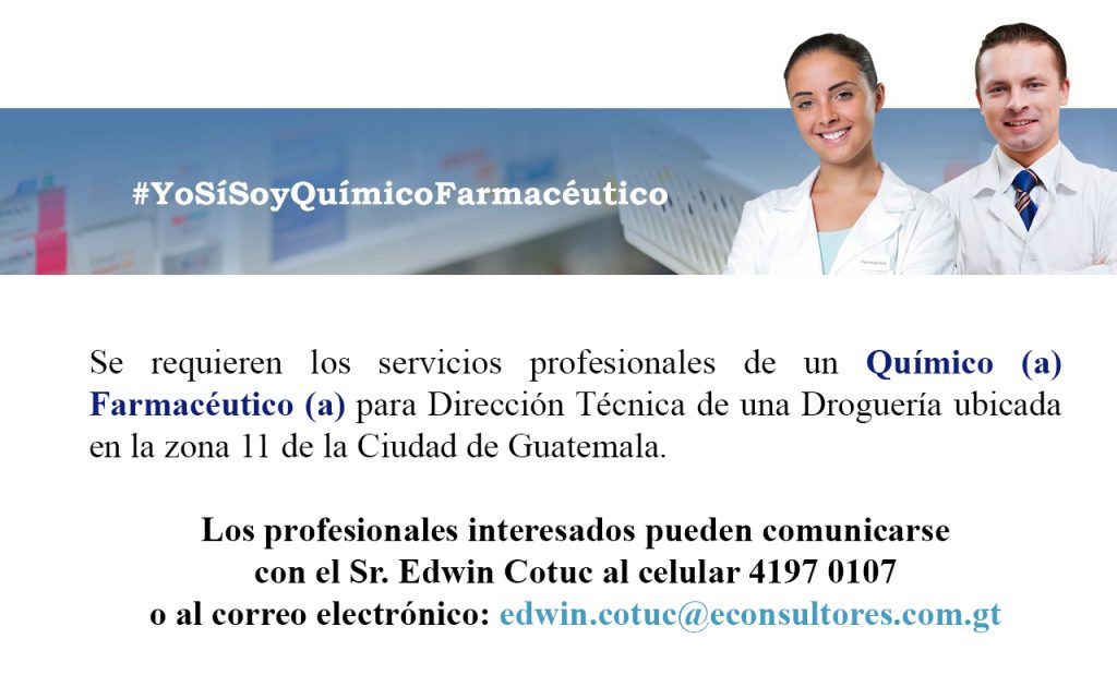 Oportunidad laboral para Químico (a) Farmacéutico (a) para Dirección Técnica de Droguería.
