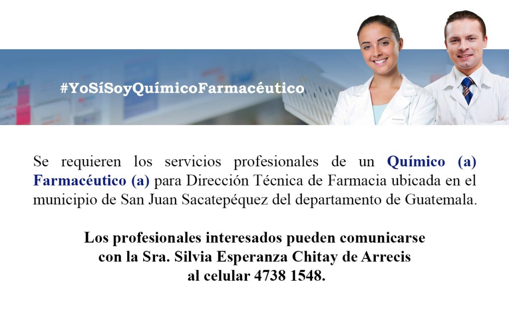 Oportunidad laboral para Químico (a) Farmacéutico (a) para Dirección Técnica de Farmacia en San José Sacatepéquez.