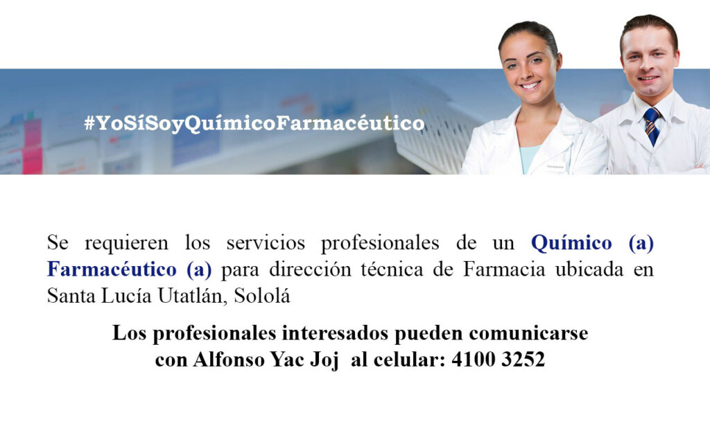 Oportunidad laboral para Químico (a) Farmacéutico (a) para Dirección Técnica de Farmacia en Sololá.