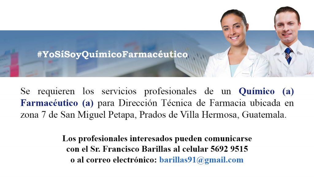 Oportunidad laboral para Químico (a) Farmacéutico (a) para Dirección Técnica de Farmacia en Villa Hermosa.