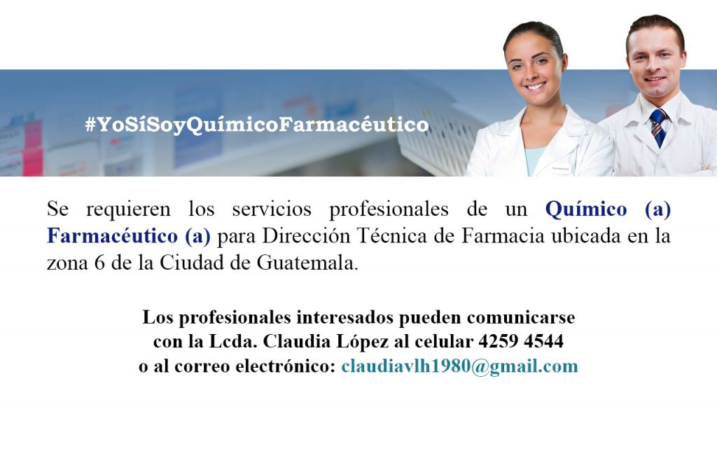 Oportunidad laboral para Químico (a) Farmacéutico (a) para Dirección Técnica de Farmacia ubicada en la Ciudad de Guatemala.