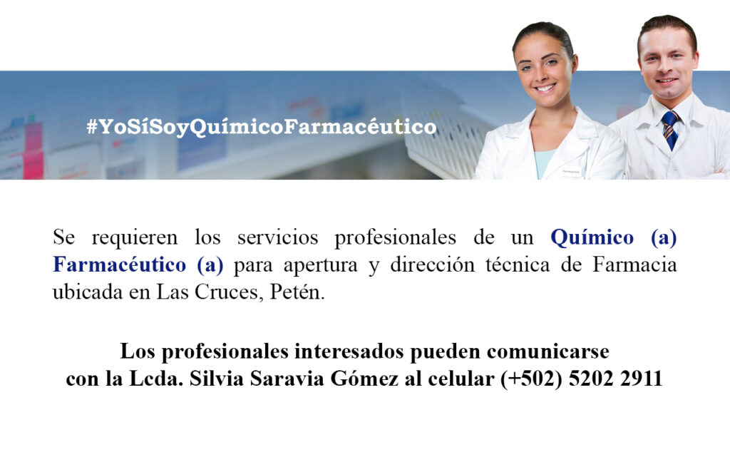 Oportunidad laboral para Químico (a) Farmacéutico (a) para dirección técnica de Farmacia ubicada en Petén.