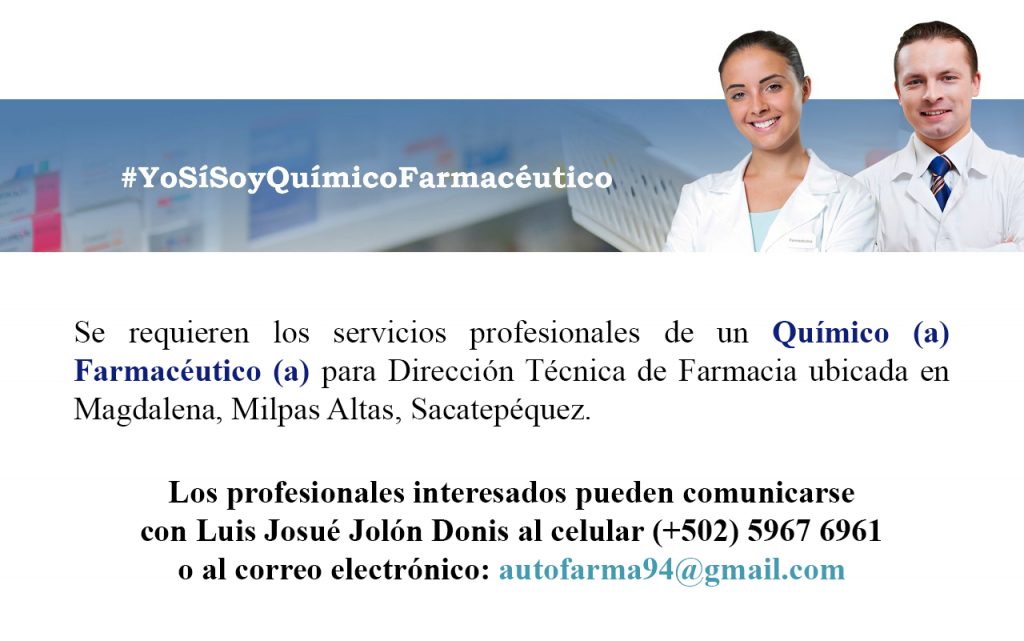 Oportunidad laboral para Químico (a) Farmacéutico (a) para Dirección Técnica de Farmacia ubicada en Sacatepéquez.