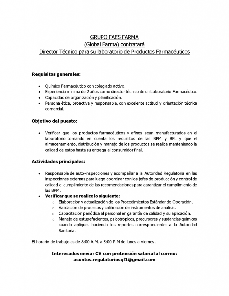 Oportunidad laboral para Químico (a) Farmacéutico (a) para Dirección Técnica de Laboratorio Farmacéutico.