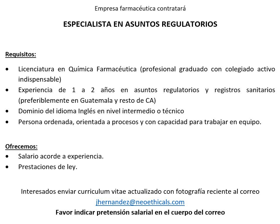 Oportunidad Laboral para Químico (a) Farmacéutico (a) para Especialista en Asuntos Regulatorios.