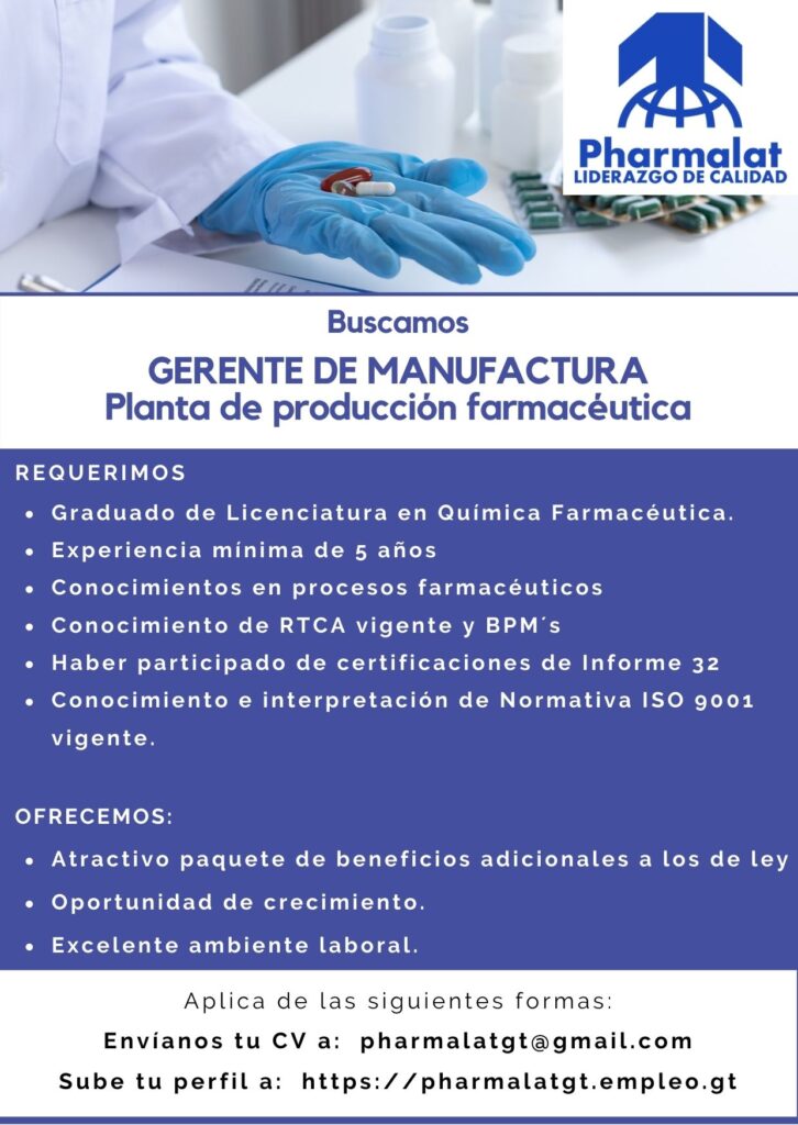 Oportunidad laboral para Químico (a) Farmacéutico (a) para Gerente de Manufactura.