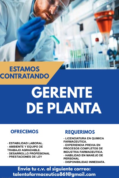 Oportunidad Laboral para Químico (a) Farmacéutico (a) para Gerente de Planta.