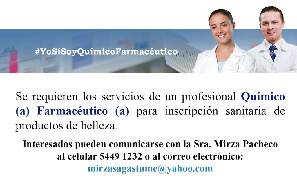 Oportunidad laboral para Químico (a) Farmacéutico (a) para inscripción sanitaria de productos de belleza.
