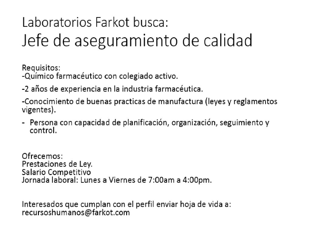 Oportunidad laboral para Químico (a) Farmacéutico (a) para Jefe de Aseguramiento de Calidad.