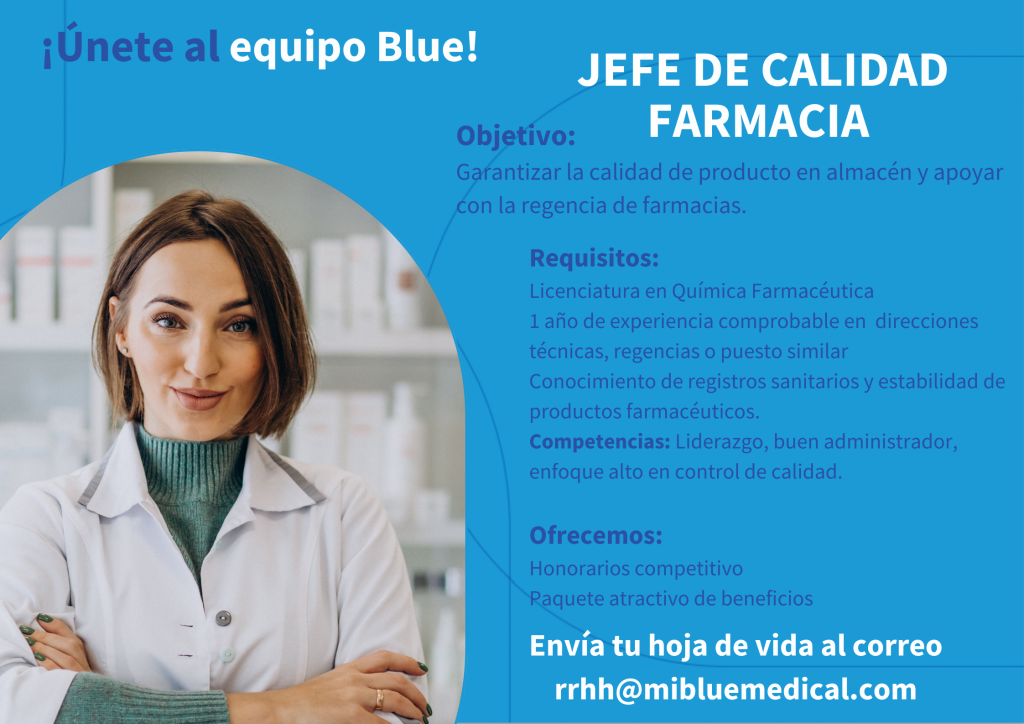 Oportunidad laboral para Químico (a) Farmacéutico (a) para Jefe de Calidad (Farmacia).