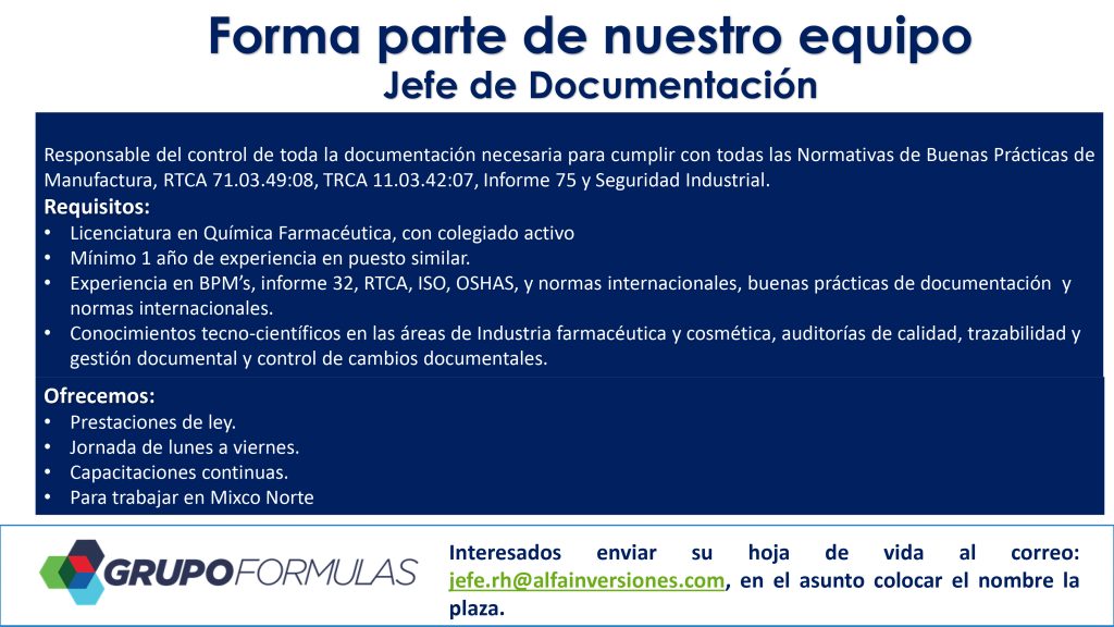 Oportunidad laboral para Químico (a) Farmacéutico (a) para Jefe de Documentación.