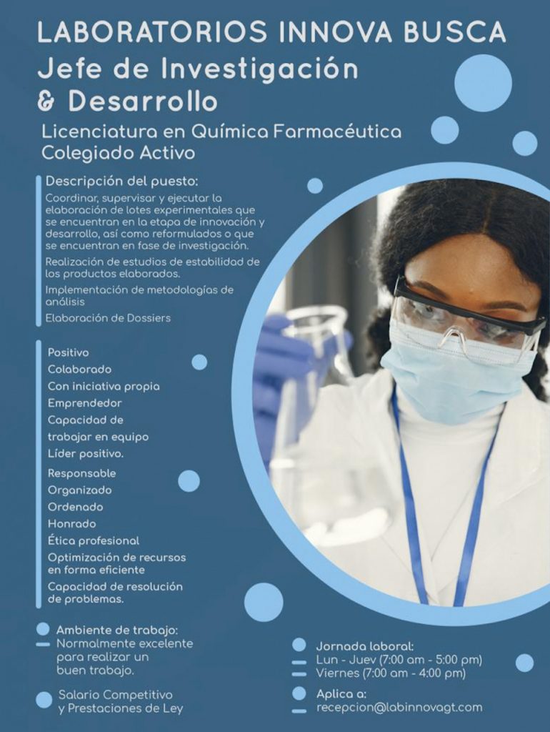Oportunidad laboral para Químico (a) Farmacéutico (a) para Jefe de Investigación y Desarrollo.