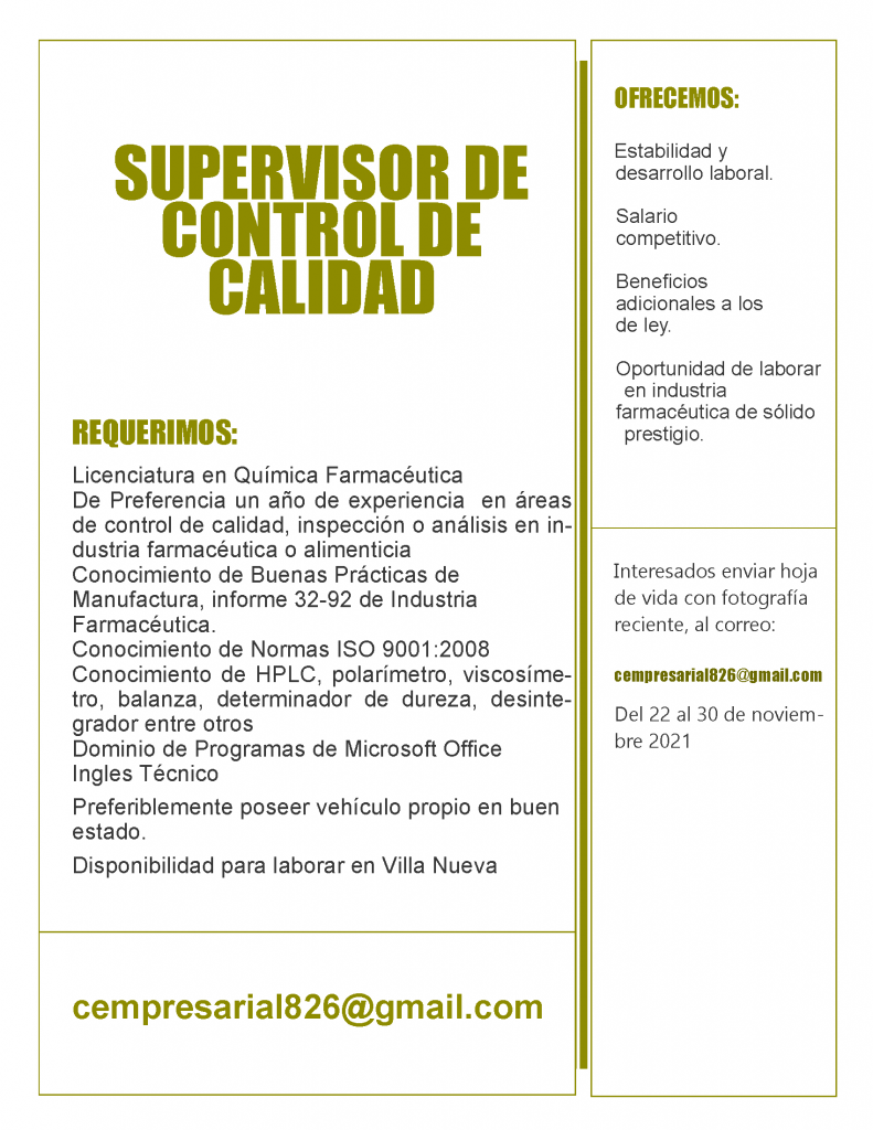 Oportunidad Laboral para Químico (a) Farmacéutico (a) para Supervisor de Control de Calidad.