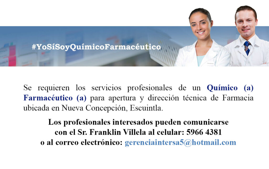 Oportunidad laboral para Químicos (as) Farmacéuticos (as) para apertura y dirección técnica de Farmacia en Nueva Concepción, Escuintla.