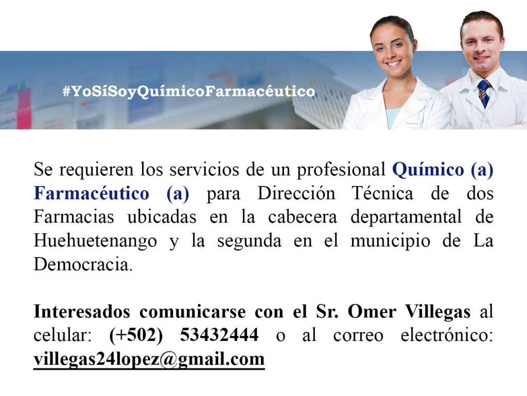 Oportunidad laboral para Químicos (as) Farmacéuticos (as) para Direcciones Técnicas de Farmacias en Huehuetenango.
