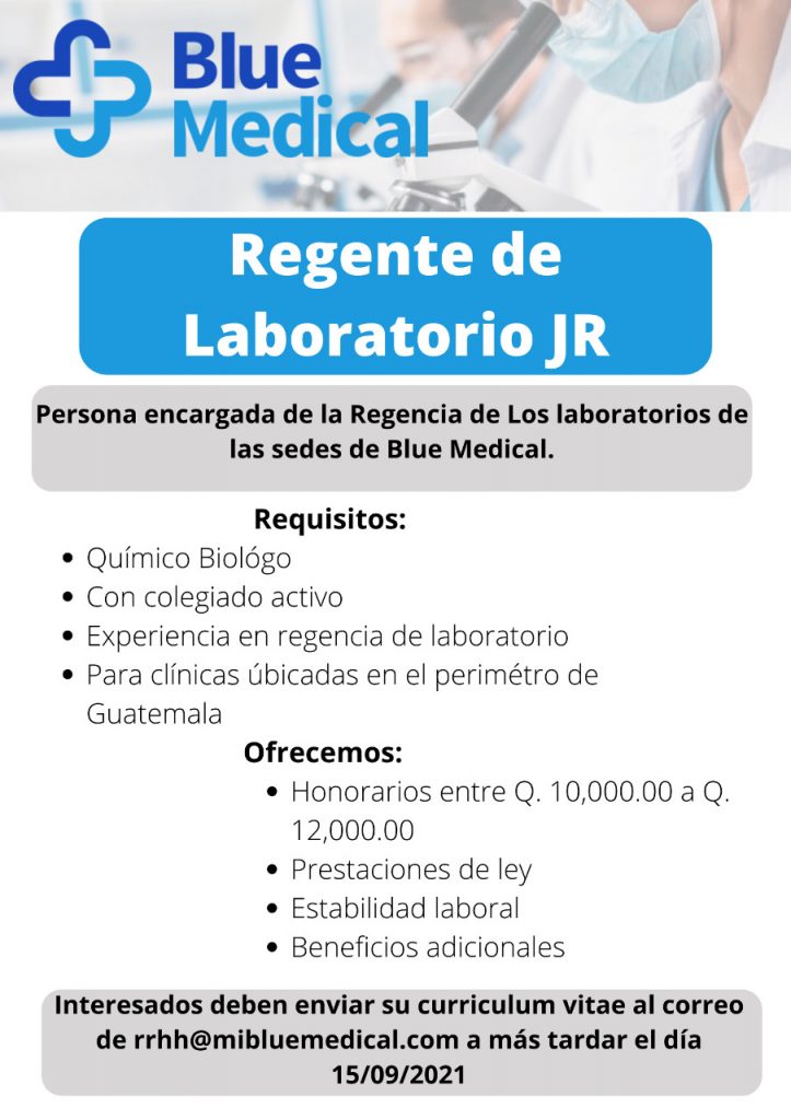 Oportunidad Laboral para Regente de Laboratorio JR para Blue Medical.